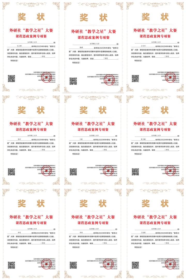 为全面推进高校外语课程思政高质量建设,落实立德树人根本任务,7月21日至31日,2025年外研社“教学之星”大赛课程思政案例专项赛成功举行。我院积极组织教师参赛,最终获得一等奖1项、二等奖4项、三等奖4项。在主赛道,李雪荣获二等奖,李同荣获三等奖。在“理解当代中国”赛道,石立林荣获一等奖,尧可、万虹、陈黄荣获二等奖,王可可、张玉婕、王佳歆荣获三等奖。获奖人数位列江西省高校第三。
