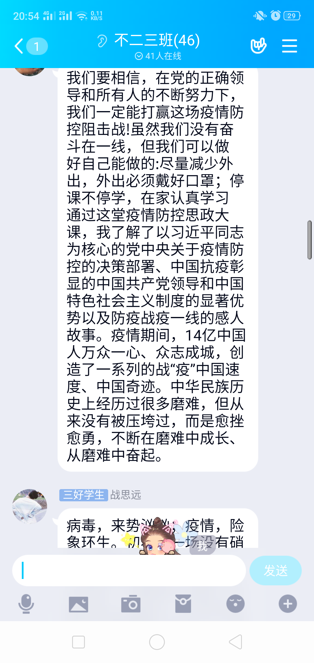 观看完疫情防控思政大课后,大部分学生表示受益颇多,有豁然开朗之感。钟薇同学认为思政课程的观看,让同学们对新型冠状病毒有了更加深刻、鲜明的了解和认识,并且坚信在中国共产党的坚强领导下,病毒终将被战胜;杜海琼和公明珠同学表示,新型冠状肺炎防疫防控工作是摆在全党和全国人民面前的一场具有新的历史特点的伟大斗争,这场实践大课,向全国大学生推送了党领导人民抗击疫情的感人故事,传播了社会主义核心价值观的大爱精神;谢雨轩同学呼吁每一位大学生要从自身做起,严格做到少出门,出门带口罩,回家勤洗手,同时在家做到停课不停学,好好学习;詹婷婷,高张灵,刘琦和钟婷等同学呼吁:每个公民都要坚决杜绝食用野生动物,拒绝非法来源的药用野生动物制品,并推动形成敬畏自然、尊重自然、顺应自然的绿色发展方式。