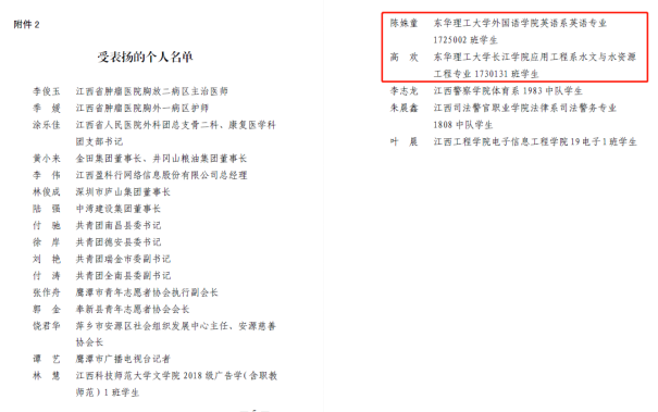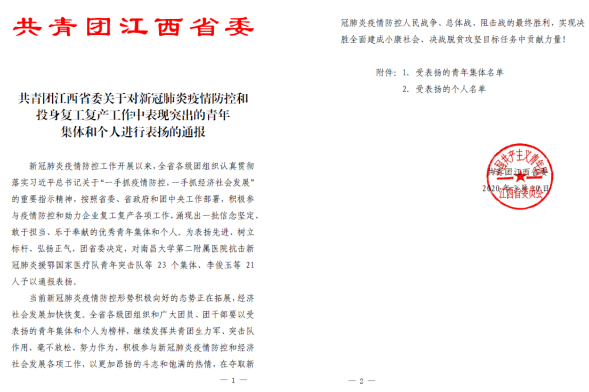 自新冠肺炎疫情发生以来,全国广大志愿者挺身而出,为打赢疫情防控阻击战、守护人民群众生命健康作出了积极贡献。3月11日,共青团江西团委关于对新冠肺炎疫情防控和投身复工复产工作中表现突出的亲年集体和个人进行了表扬的通报。东华理工大学网投在线英语专业1725002班陈姝童同学因在疫情防控志愿者服务工作中表现突出而受到团省委的表彰。