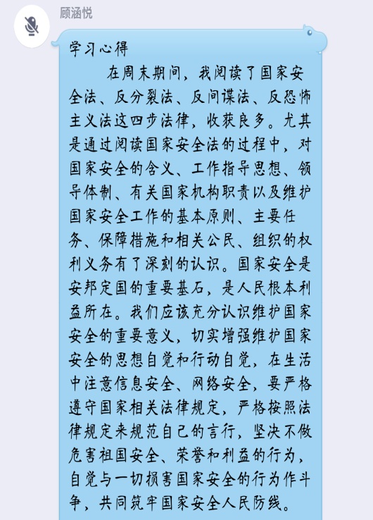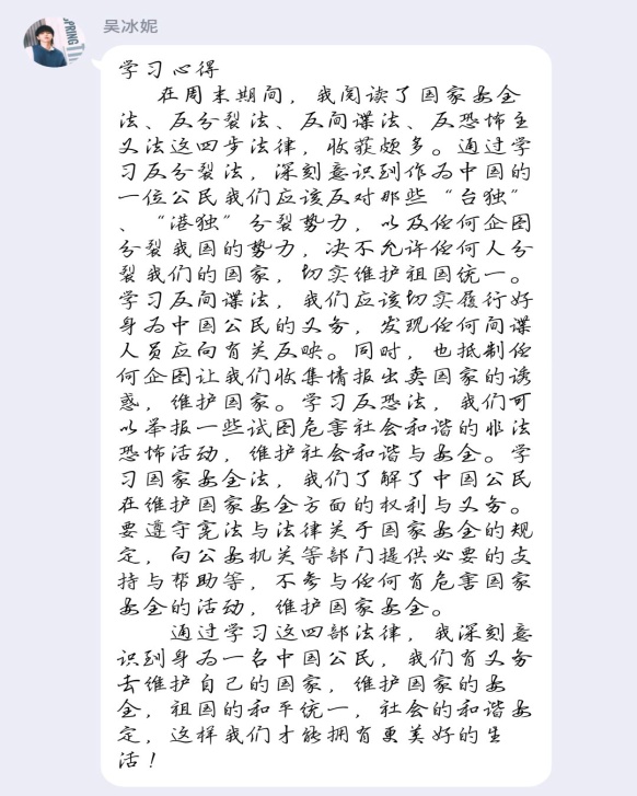 维护国家安全的法律有《中华人民共和国宪法》、《国家安全法》、《反分裂国家法》、《反间谍法》、《网络安全法》、《反恐怖主义法》、《中华人民共和国境外非政府组织境内活动管理法》、《中华人民共和国国家情报法》等,为了进一步切实提高师生的国家安全意识,营造维护国家安全的浓厚法治氛围,我院积极组织全院师生学习了《国家安全法》、《反分裂国家法》、《反间谍法》、《反恐怖主义法》等法律的相关内容,并就学习相关法律内容时的一些心得,通过线上QQ群,进行了交流。