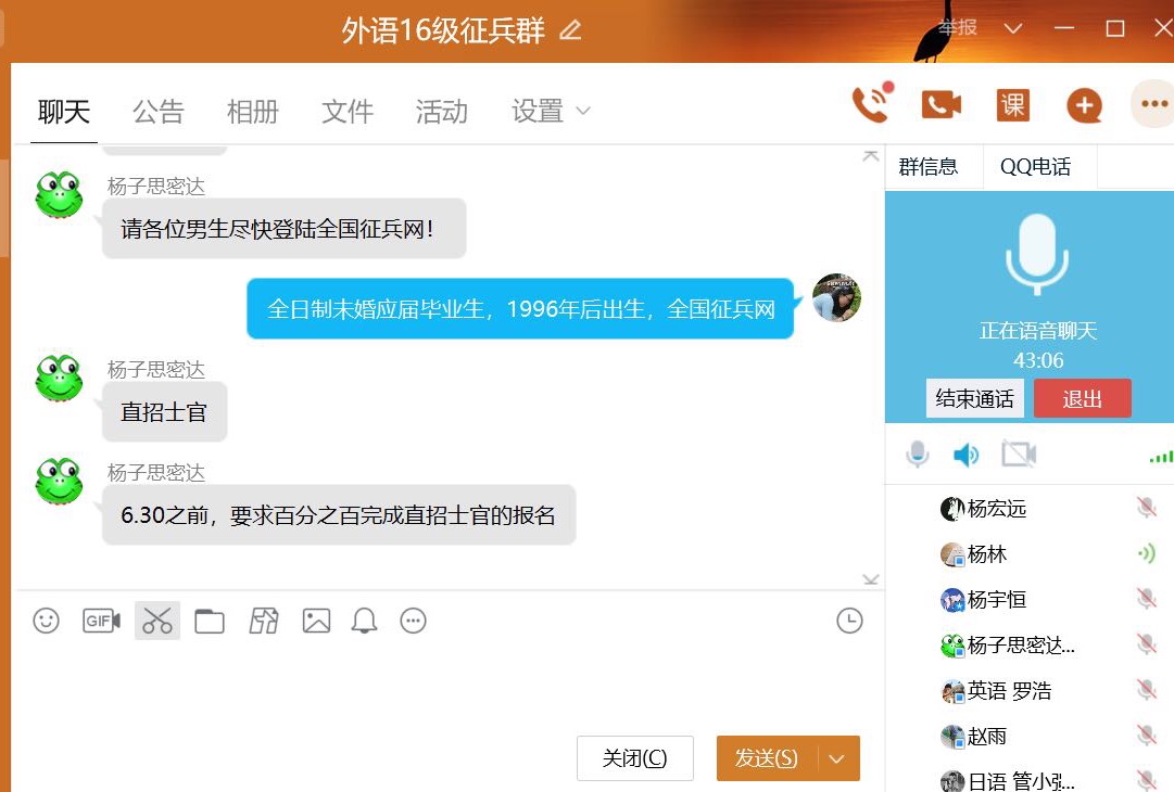 为加强征兵政策宣传,做好2020届毕业生征兵宣传动员工作,5月25日晚八点,外语学院组织线上会议,党委副书记杨林、学团办主任杨子赟以及学院毕业班全体男生参加了此次会议。