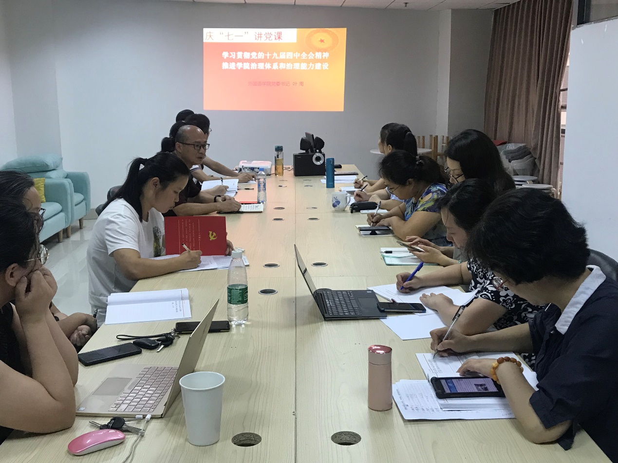 为庆祝建党九十九周年,充分发挥党支部教育管理监督党员和组织宣传凝聚服务群众的作用,根据学校“三级书记”讲党课活动安排,网投在线党委书记叶周同志于7月2日在核工楼206向英语系教工党支部全体党员讲授题为“学习贯彻党的十九届四中全会精神,推进学院治理体系和治理能力建设”的党课。