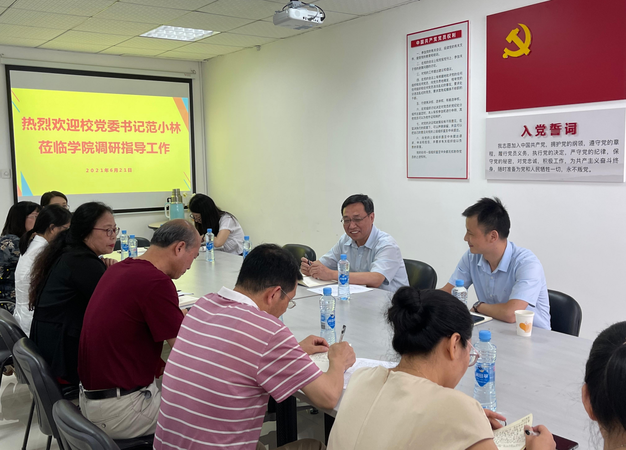 为扎实推进学校党史学习教育高质量开展,进一步开拓为师生办实事的思路举措、方式方法,切实解决学校改革发展稳定和师生切身利益的“急难愁盼”问题,6月21日下午,校党委书记范小林在校党委办公室、校长办公室副主任夏元平陪同下深入我院调研指导工作。学院班子成员、各系、科室负责人参加座谈会。