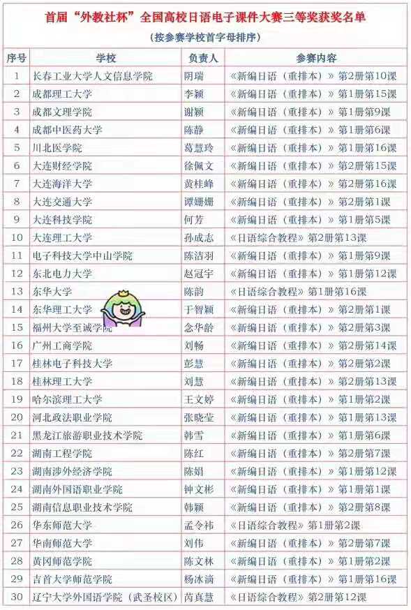 由教育部高等学校外国语言文学类专业教学指导委员会日语分委员会、中国日语教学研究会和上海外语教育出版社联合举办的首届“外教社杯”全国高校日语电子课件大赛,吸引了来自全国近两百所高校逾两百个参赛作品。