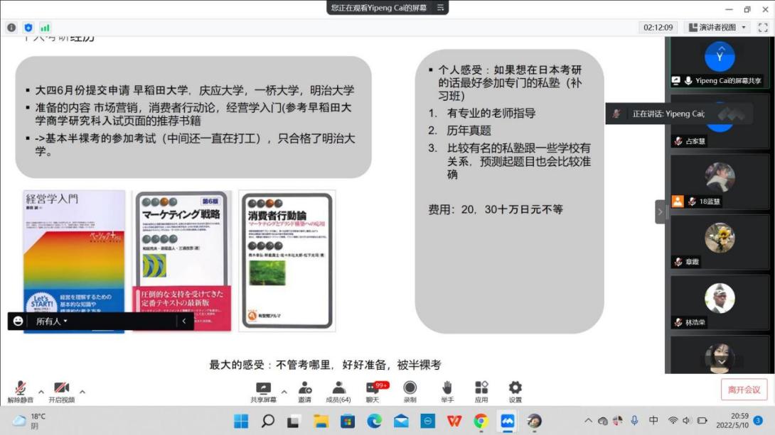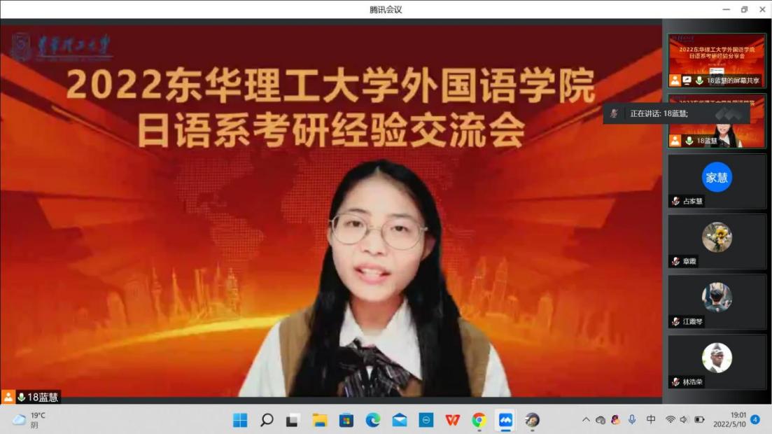 为加强学生对考研知识和经验的了解,营造积极向上的学风,进一步加强学生对研究生入学考试的认识,了解前沿的就业形势、增强考研斗志。5月10日晚7:00—9:30,我院日语专业举行了一场线上考研交流活动。日语专业章霞、白玉兰、于智颖、洪海萍老师及日语系所有在校生参会。