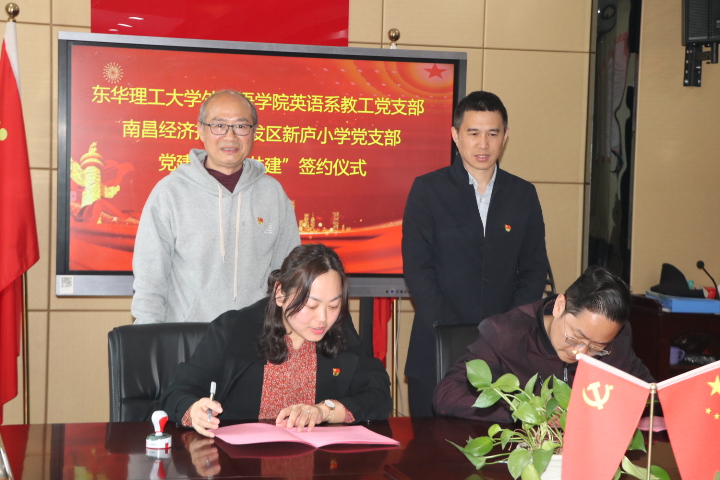 为加强基层党组织建设,创新党建工作机制,中共东华理工大学网投在线英语系教工党支部与新庐小学党支部确立为党建结对共建单位,并于2023年4月7日举行党建“结对共建”签约仪式。