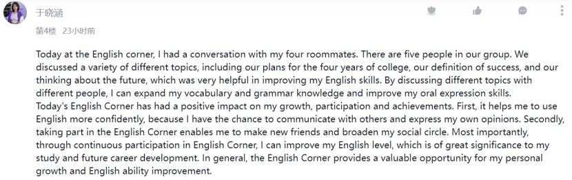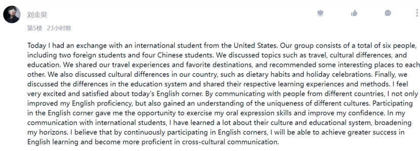 刘同学:参加英语角让我有机会练习英语,说英语的过程中提升了我的自信。和留学生交流的过程中,增进了我对他们的文化和教育制度的了解,拓宽了我的视野。