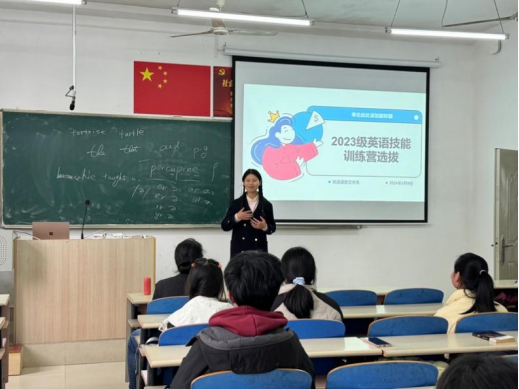 2024年3月8日16点,英语语言文学系组织了2023级英语技能训练营的营员选拔。每位同学都自信大方,参与热情极高。他们都愿意并敢于走到讲台前,用英语表达观点,展示自己的风采。