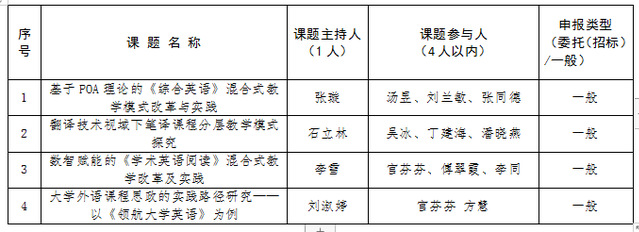 近日,网投在线教改课题共获得四项立项,分别为:张璇——基于POA理论的《综合英语》混合式教学模式改革与实践;石立林——翻译技术视域下笔译课程分层教学模式探究;李雪——数智赋能的《学术英语阅读》混合式教学改革及实践;刘淑婷——大学外语课程思政的实践路径研究——以《领航大学英语》为例。