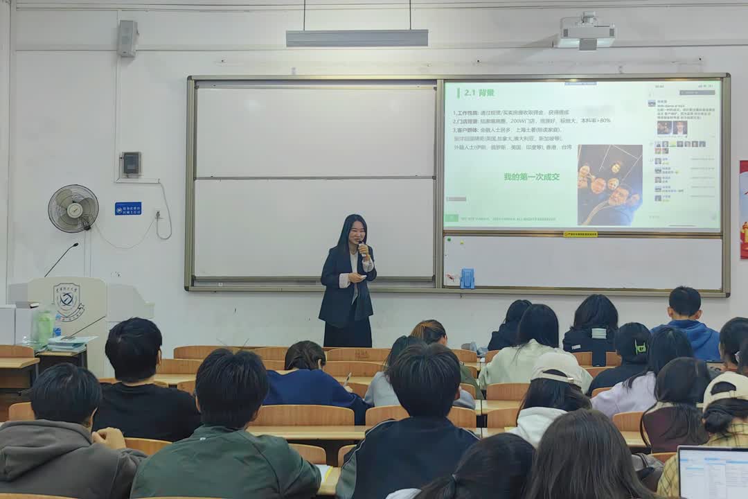 钟秀莲分享了其自毕业以来,加入上海链家公司后的“外语+房产销售”职业经历及宝贵经验。同时,她阐述了外国语学生在生意洽谈中的优势,减少了学生对于外语专业未来的顾虑,并针对学生的疑惑一一解答,提出了实用性建议。