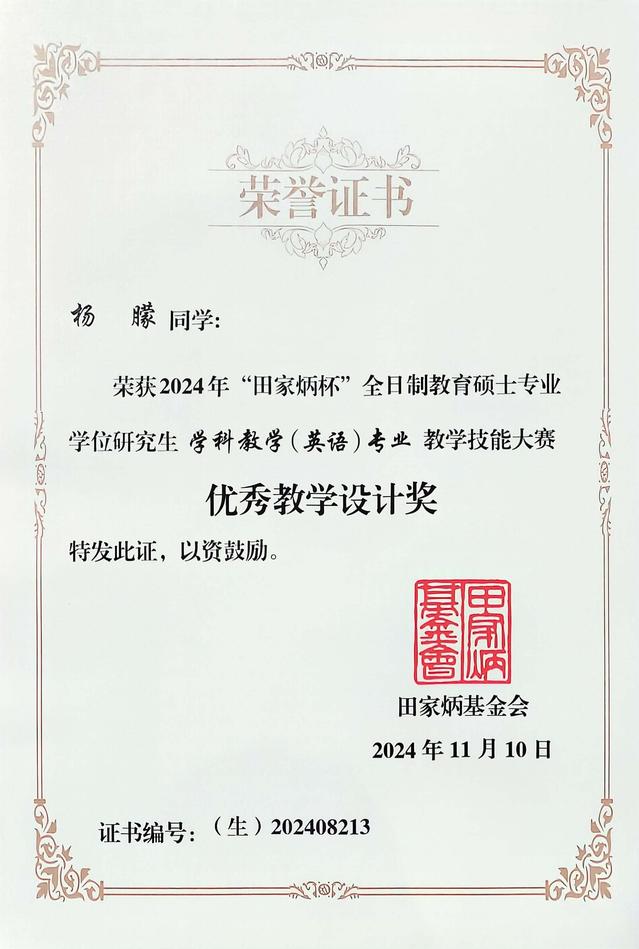 2024年11月8日至10日,网投在线2022级学科教学(英语)专业硕士研究生杨朦参加了在江苏师范大学举办的全国“田家炳杯”全日制教育硕士专业学位研究生学科教学(英语)专业教学技能大赛决赛,荣获优秀教学设计奖(指导老师:陈彩芬)。